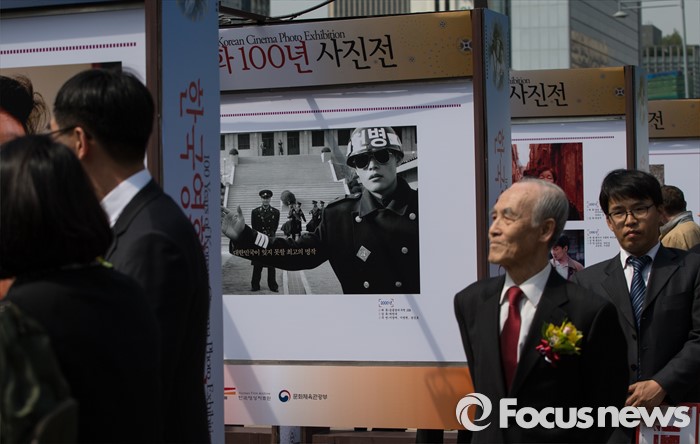 (서울=포커스뉴스) 18일 오후 서울시청 앞 광장에서 열린 '한국영화 100년 사진전' 개막식에서 영화 관계자들과 시민들이 전시된 사진을 살펴보고 있다.