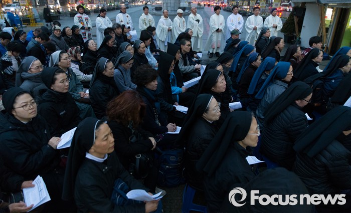 (서울=포커스튜스) 세월호 참사 2주기가 이틀 지난 18일 오후 서울 종로구 광화문광장에서 신부들과 시민들이 '세월호 희생자 기억미사'에 참석하고 있다.