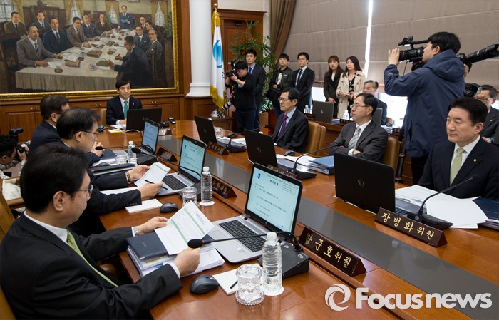 (서울=포커스뉴스) 19일 오전 서울 중구 남대문로 한국은행 본관에서 열린 금융통화위원회의에 참석한 이주열 한국은행 총재와 금통위원들이 개회를 기다리고 있다.