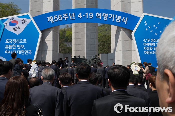 (서울=포커스뉴스) 19일 오전 서울 강북구 국립 4.19 민주묘지를 찾은 손학규 전 더불어민주당 상임고문과 지지자들이 참배하고 있다.