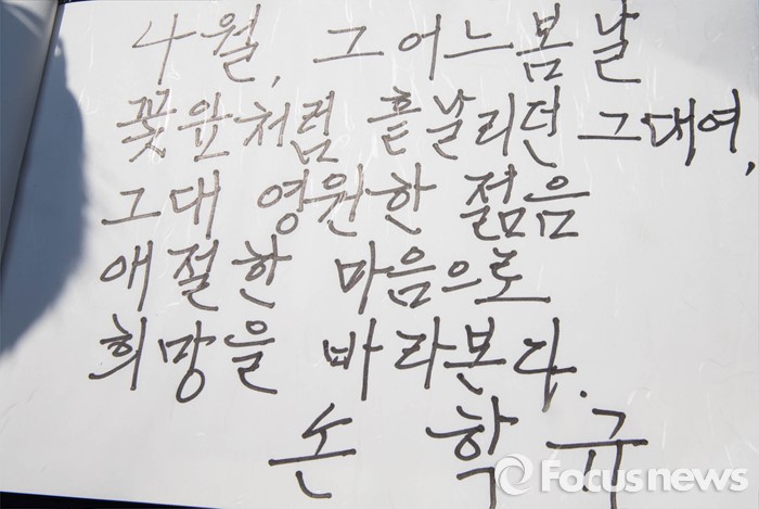 (서울=포커스뉴스) 19일 오전 손학규 전 더불어민주당 상임고문이 서울 강북구 국립 4.19민주묘지를 찾아 참배한 뒤 남긴 방명록 글귀