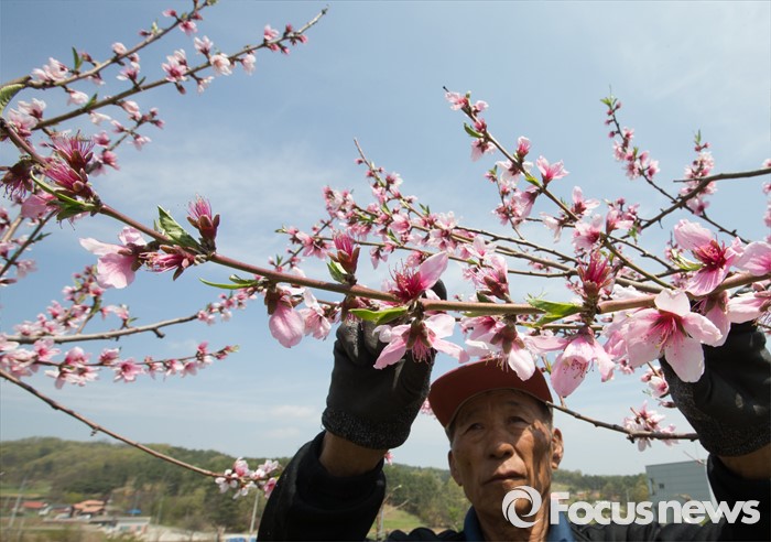 (세종=포커스뉴스) 화창한 봄 날씨를 보인 19일 오전 세종시 연서면 복숭아밭에서 농민이 복사꽃을 속아내고 있다.