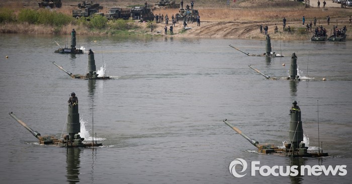 (여주=포커스뉴스) 19일 오전 경기도 여주시 남한강 일대에서 육군 20사단이 K-2 흑표전차 잠수도하훈련을 하고 있다. K-2흑표전차는 최고 4.1m수심의 하천을 문교나 부교없이 독자적으로 건널 수 있다.