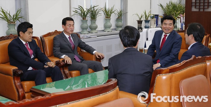 (서울=포커스뉴스) 원유철 새누리당 원내대표가 19일 오후 서울 여의도 국회에서 원 원내대표의 비상대책위원회 체제에 반대 입장을 가진 의원 및 당선인으로 구성된 당 혁신모임(가칭) 소속 의원들과 면담을 하고 있다. 왼쪽부터 오신환, 황영철, 하태경 의원, 원 원내대표, 김영우 의원.