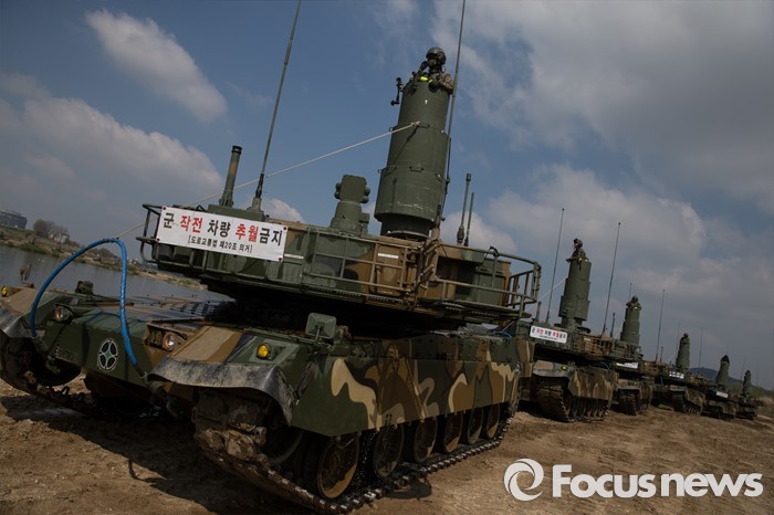 (여주=포커스뉴스) 19일 오전 경기도 여주시 남한강 일대에서 육군 20사단이 K-2 흑표전차 잠수도하훈련을 하고 있다. K-2흑표전차는 최고 4.1m수심의 하천을 문교나 부교없이 독자적으로 건널 수 있다.