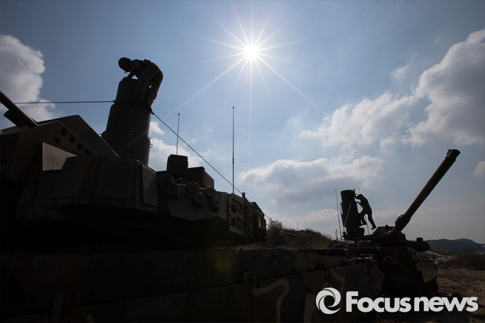 (여주=포커스뉴스) 19일 오전 경기도 여주시 남한강 일대에서 육군 20사단이 K-2 흑표전차 잠수도하훈련을 하고 있다. K-2흑표전차는 최고 4.1m수심의 하천을 문교나 부교없이 독자적으로 건널 수 있다.