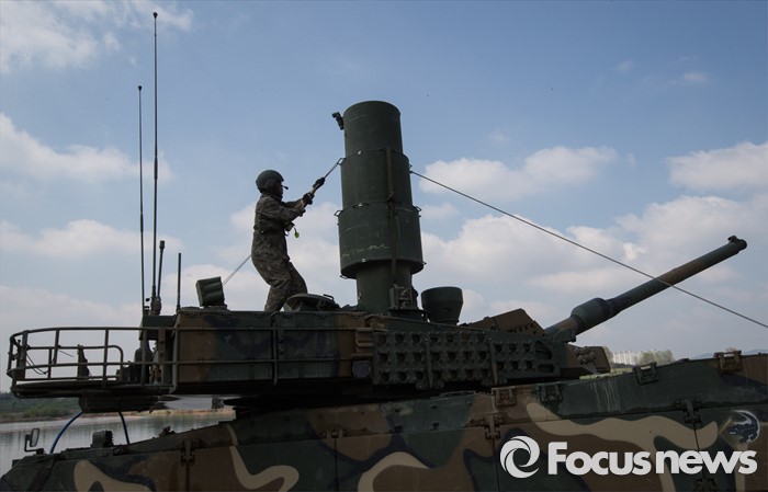 (여주=포커스뉴스) 19일 오전 경기도 여주시 남한강 일대에서 육군 20사단이 K-2 흑표전차 잠수도하훈련을 하고 있다. K-2흑표전차는 최고 4.1m수심의 하천을 문교나 부교없이 독자적으로 건널 수 있다.