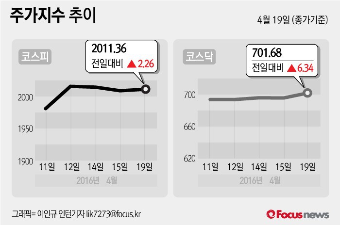 19일 코스피지수는 전거래일 보다 0.11%(2.26포인트) 상승한 2011.36에 장을 마감했다. 코스닥지수는 전거래일 대비 0.91%(6.34포인트) 오른 701.68에 거래를 마쳤다. 코스피는 유가 우려 해소에 외국인과 기관이 매수에 나서면서 장중 2020선을 돌파하기도 했다.