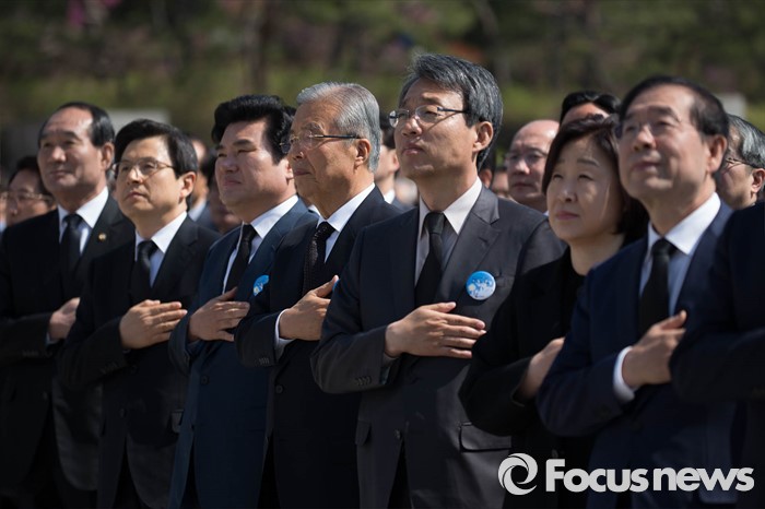또 손학규 전 더민주 상임고문은 4·19민주묘지에서의 기념식이 끝난 후 자신의 측근인사들을 대거 대동, 참배했다.19일 오전 서울 강북구 국립 4.19 민주묘지에서 열린 '제56주년 4.19혁명 기념식'에서 황교안(왼쪽 두 번째부터) 국무총리, 원유철 새누리당 원내대표, 김종인 더불어민주당 비대위 대표, 김성식 국민의당 20대 국회의원 당선자, 심상정 정의당 대표, 박원순 서울시장이 국민의례를 하고 있다. 2016.04.19 이승배 기자
