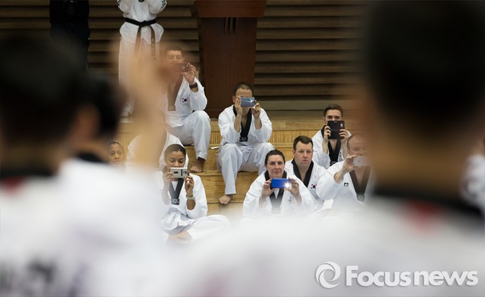 (서울=포커스뉴스) 19일 오후 서울 용산구 국방부 다목적홀에서 한국문화 체험행사에 참가한 주한미군 장병들이 국방부 태권도 시범단을 촬영하고 있다.