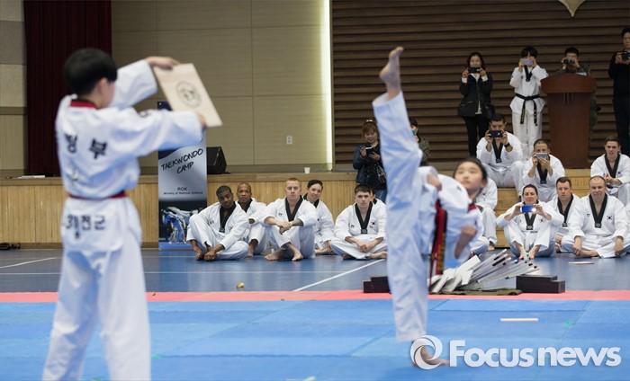 (서울=포커스뉴스) 19일 오후 서울 용산구 국방부 다목적홀에서 한국문화 체험행사에 참가한 주한미군 장병들이 국방부 태권도 시범단의 시범을 보고 있다.