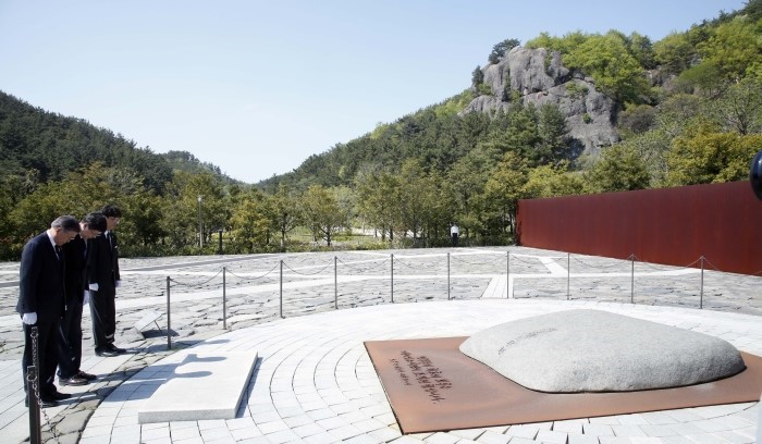 | △ 노무현 전 대통령 묘역 참배하는 문재인-김홍걸 |