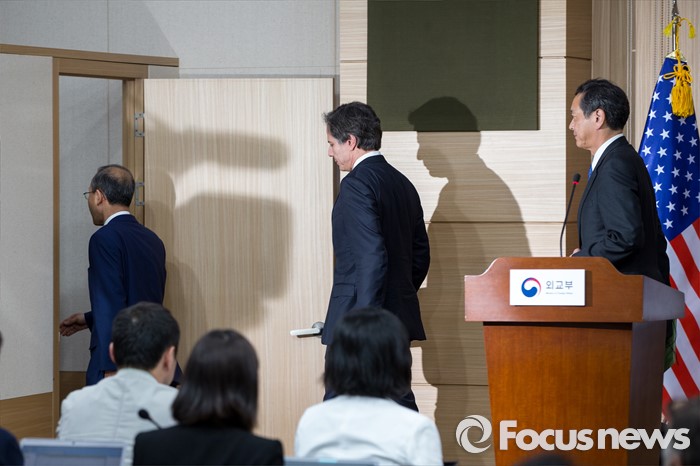 (서울=포커스뉴스) 한미일 외교차관이 19일 오후 서울 종로구 외교부에서 '제3차 한미일 외교차관 협의회' 결과 발표를 마친 뒤 브리핑실을 나서고 있다. 왼쪽부터 임성남 외교부 제1차관, 토니 블링컨 미국 국무부 부장관, 사이키 아키타카 일본 외무성 사무차관.