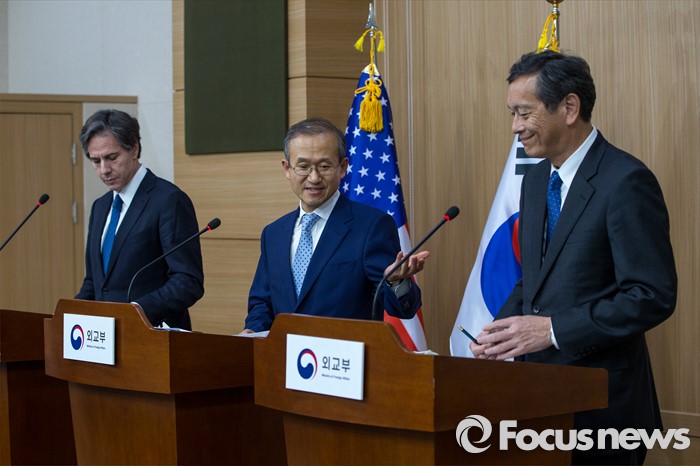 (서울=포커스뉴스) 임성남 외교부 제1차관이 19일 오후 서울 종로구 외교부에서 '제3차 한미일 외교차관 협의회' 결과 발표를 마친 뒤 사이키 아키타카 일본 외무성 사무차관에게 발언을 권유하고 있다.