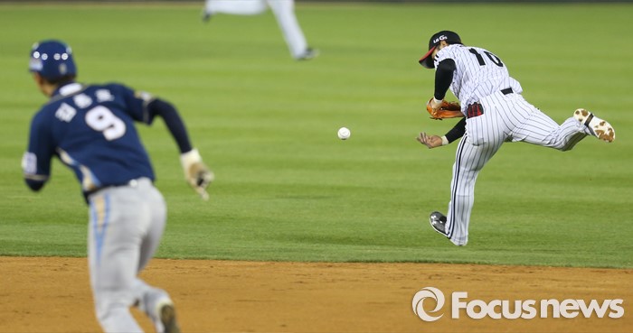 (서울=포커스뉴스) 19일 서울 잠실구장에서 열린 2016 프로야구 NC-LG 경기 5회초 2사 1루에서 NC 이종욱의 타구를 LG 2루수 이천웅이 역동작으로 잡으려다 놓치고 있다. NC 주자는 김종호.