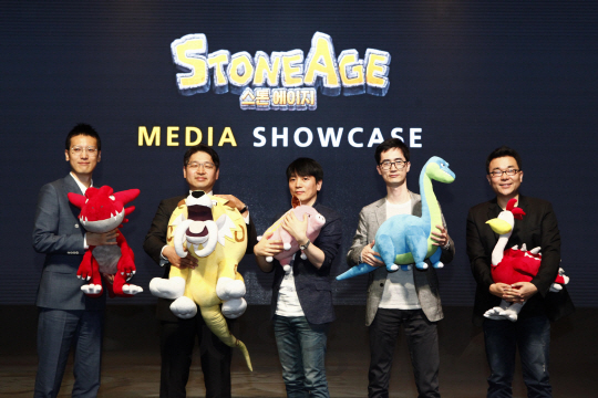 또한 스톤에이지에 대한 추억과 응원을 남긴 이용자 중 추첨을 통해 스타벅스 키프티콘을 제공한다. 사전 예약자가 100만명을 돌파하면 걸그룹 아이오아이(I.O.I)가 직접 부른 로고송을 공식 홈페이지 등을 통해 공개할 예정이다.왼쪽부터 박영재 넷마블게임즈 사업본부장, 백영훈 넷마블게임즈 부사장, 최정호 넷마블엔투 대표, 오재훈 넷마블엔투 부사장, 김도웅 넷마블엔투 PD <사진제공=넷마블게임즈>