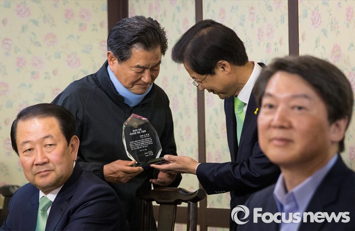 (서울=포커스뉴스) 천정배 국민의당 상임공동대표가 20일 오후 서울 마포 불교방송국 지하 1층의 한 음식점에서 열린 국민의당 소속 제19대 국회의원 오찬 간담회장에 참석해 신학용 의원에게 감사패를 전달하며 인사하고 있다.