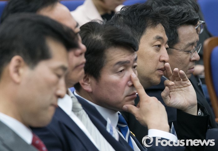 (서울=포커스뉴스) 20일 오전 서울 여의도 국회에서 열린 더불어민주당 20대 총선 당선자 대회에 참석한 금태섭, 기동민 당선인 등이 김종인 비대위 대표의 인사말을 듣고 있다.