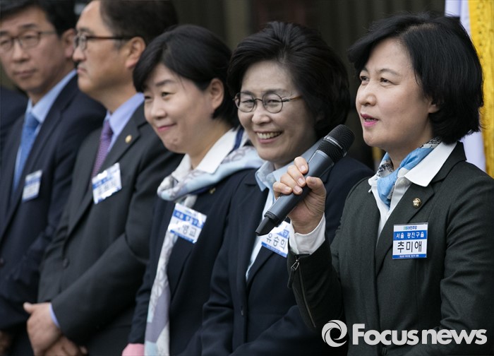 (서울=포커스뉴스) 20일 오전 서울 여의도 국회에서 열린 더불어민주당 20대 총선 당선자 대회에 참석한 추미애 당선인이 인사말을 하고 있다.