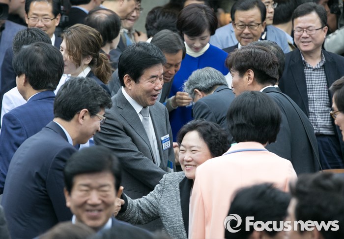 | △ 동료들과 인사하는 김진표 |