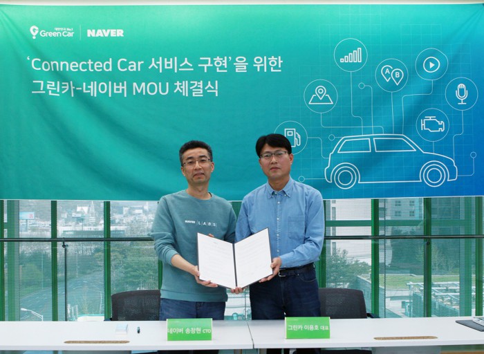 한편, 그린카는 네이버와 공동으로 구축한 '커넥티드 카' 서비스 플랫폼을 연내 전 차종에 탑재할 계획이다.그린카 이용호 대표이사(오른쪽)와 네이버 송창현 CTO가 '커넥티드 카'서비스 구현을 위한 MOU를 체결한 후 기념촬영하고 있다.<사진제공=그린카>
