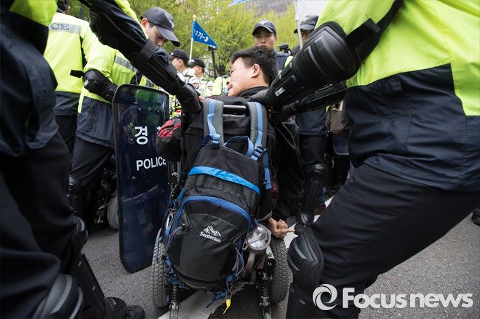 (서울=포커스뉴스) 20일 오후 서울 광화문 광장에서 '420장애인차별철폐 투쟁결의대회'를 마친 일부 참가자들이 행진을 하던중 예정된 진로를 벗어나자 경찰과 대치를 하고 있다.
