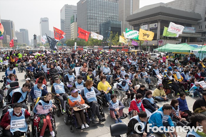 (서울=포커스뉴스) 20일 오후 서울 광화문 광장에서 420장애인차별철폐연대 공동투쟁단 단원들이 '420장애인차별철폐 투쟁결의대회'를 하고 있다.