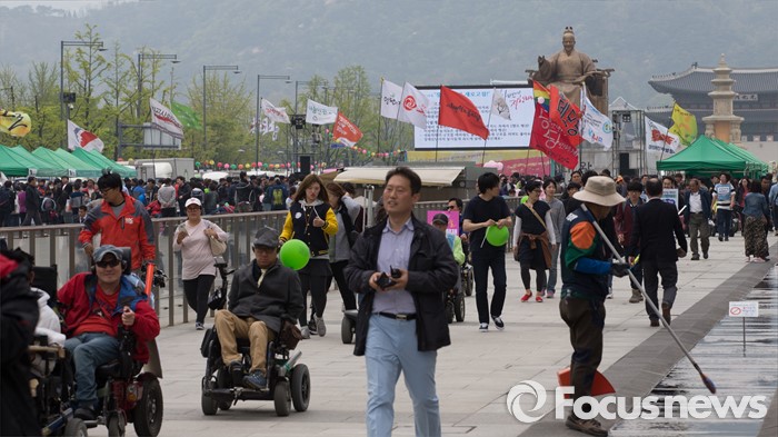 (서울=포커스뉴스) 20일 오후 서울 광화문 광장에서 420장애인차별철폐연대 공동투쟁단 단원들이 '420장애인차별철폐 투쟁결의대회'를 마치고 행진을 하고 있다.