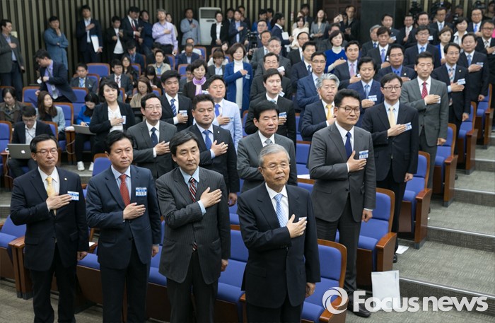 그는 "앞으로 통일에 대해 당이 잘못된 남북관계를 해결하고 선도적으로 이끌어갔으면 좋겠다"고 덧붙였다.20일 오전 서울 여의도 국회에서 열린 더불어민주당 20대 총선 당선자 대회에 참석한 김종인 비대위 대표, 이종걸 원내대표와 당선인들이 국기에 대한 경례를 하고 있다. 2016.04.20 박동욱 기자