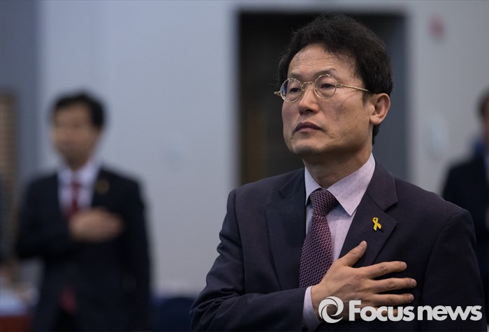 (인천=포커스뉴스) 조희연 서울시교육감이 20일 오후 인천 중구 하버파크호텔에서 열린 전국 시도교육감협의회 간담회에 참석해 국민의례 하고 있다.