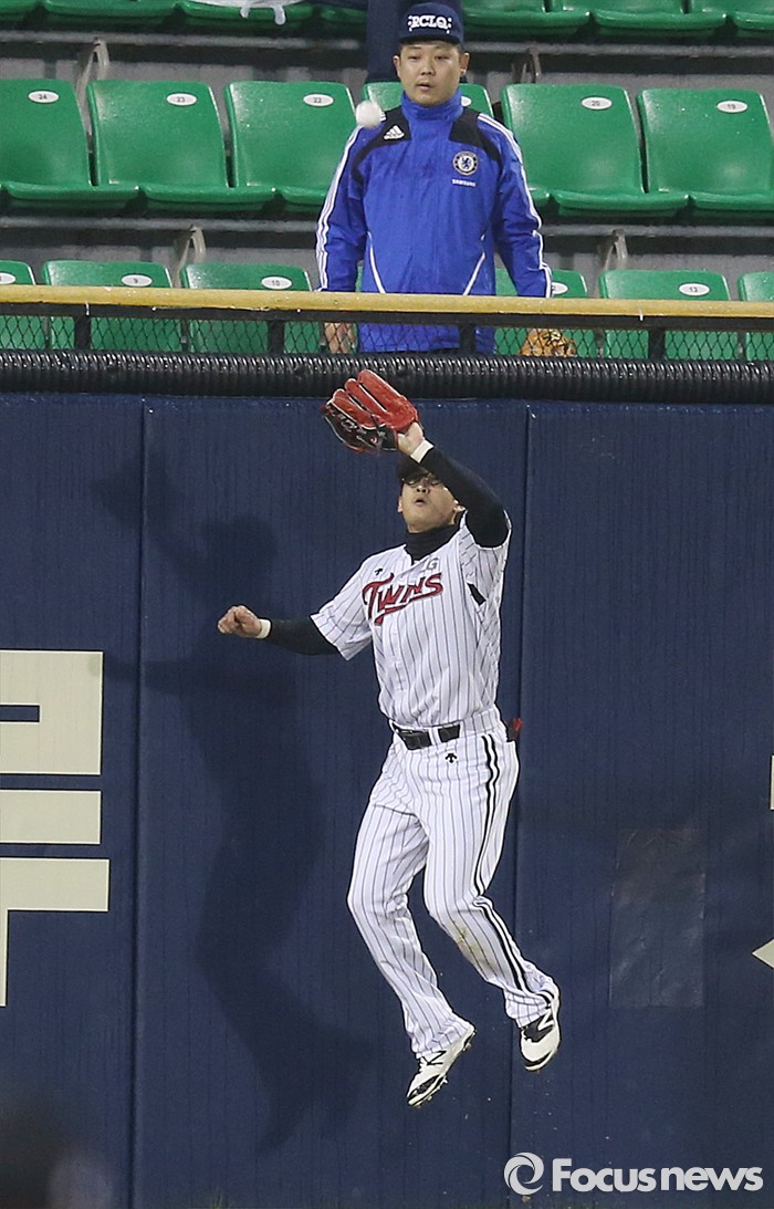 (서울=포커스뉴스) 20일 서울 잠실구장에서 열린 2016 프로야구 NC-LG 경기 3회초 무사 2,3루에서 LG 좌익수 박용택이 NC 나성범의 타구를 펜스 앞에서 점프하며 잡고 있다.