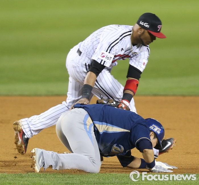 (서울=포커스뉴스) 20일 서울 잠실구장에서 열린 2016 프로야구 NC-LG 경기 7회초 무사 1,2루에서 NC 2루주자 지석훈이 LG 포수 정상호의 견제구에 걸리며 3루수 히메네스에게 태그 아웃되고 있다.