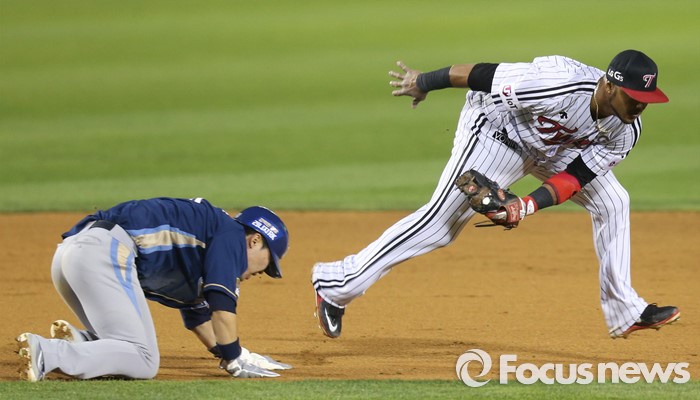 (서울=포커스뉴스) 20일 서울 잠실구장에서 열린 2016 프로야구 NC-LG 경기 7회초 무사 1,2루에서 NC 2루주자 지석훈이 LG 포수 정상호의 견제구에 걸리며 3루수 히메네스에게 태그 아웃되고 있다.