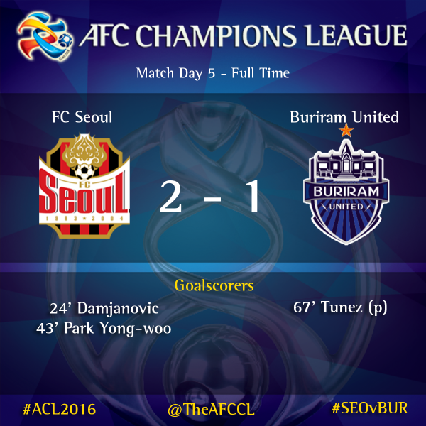 하지만 서울은 더이상 실점을 허용하지 않았다. 서울은 승리를 추가하며 4승1무(승점 13점)로 산프레체 히로시마(일본)와의 최종전 원정경기 결과에 관계없이 조 1위를 확정했다.한국프로욱구 FC서울이 20일 서울월드컵경기장에서 열린 부리람 유나이티드(태국)와의 2016 아시아축구연맹(AFC) 챔피언스리그 조별라운드 F조 5차전 홈경기에서 2-1로 승리해 16강 진출을 확정졌다. <사진출처=AFC 공식 트위터>