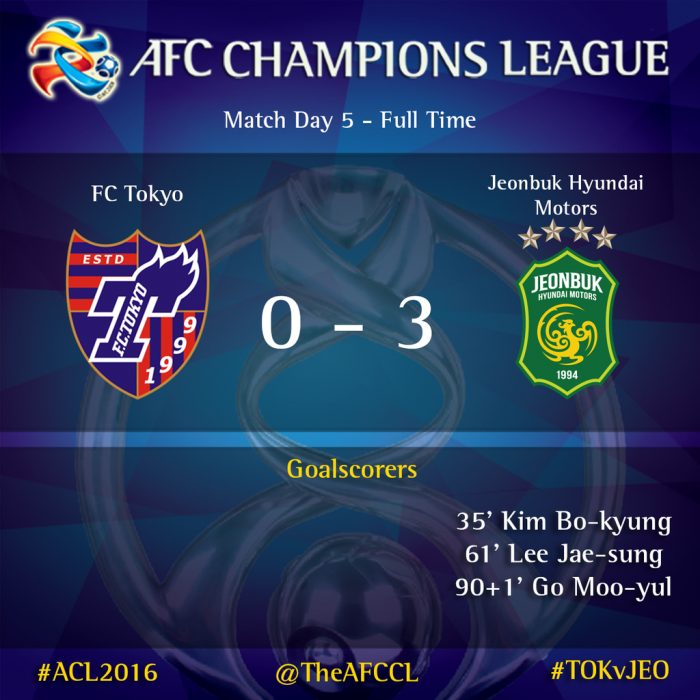 전북은 이날 승리로 3승2패(승점 9점)로 도쿄(승점 7점)를 밀어내고 조 1위로 올라섰다. 전북은 장쑤(중국)와의 6차전 홈경기 결과에 따라 16강 진출이 결정된다. 전북은 장쑤와의 경기에서 비기기만해도 16강에 오른다.한국프로축구 전북 현대가 20일 일본 도쿄 아지노모토 스타디움에서 열린 도쿄FC와의 2016 아시아축구연맹(AFC) 챔피언스리그 조별라운드 E조 5차전 원정경기에서 3-0으로 승리했다. <사진출처=AFC 공식 트위터>