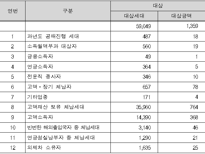 고액재산 3만6000세대·고액소득자 1만4000세대 등 5만9000세대 선정
