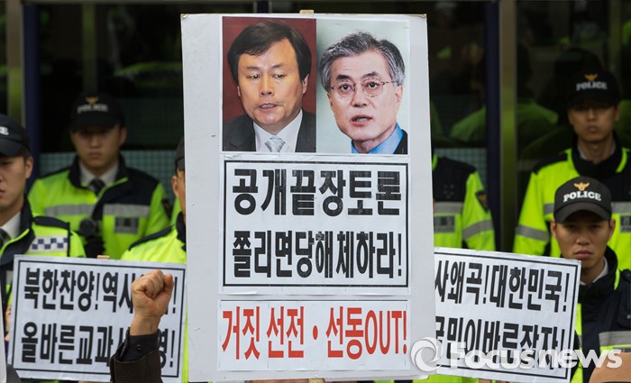 | △ 교과서 국정화 지지 기자회견 중인 보수단체 회원들 |
