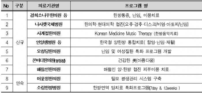 올해 선정된 기관은 (탈모)치료, (면역 암)치료 분야, 양·한방 (협진), 한방 (음악)치료, (피부미용) 및 여성 질환 치료 등 한의약을 외국인들이 쉽게 접근할 수 있는 프로그램으로 선정했다.
