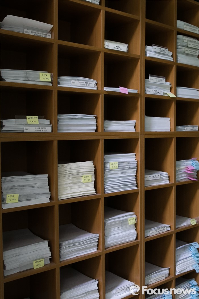 (서울=포커스뉴스) 제19대 국회 마지막 임시국회 개원일인 21일 오전 서울 여의도 국회 본관의 한 상임위원회 앞에 법안 서류들이 쌓여 있다.