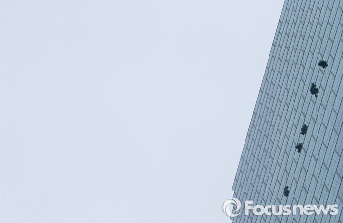 (서울=포커스뉴스) 비가 내린 21일 오전 서울 여의도 전경련회관에서 청소업체 관계자들이 회관 외벽 청소를 하고 있다.