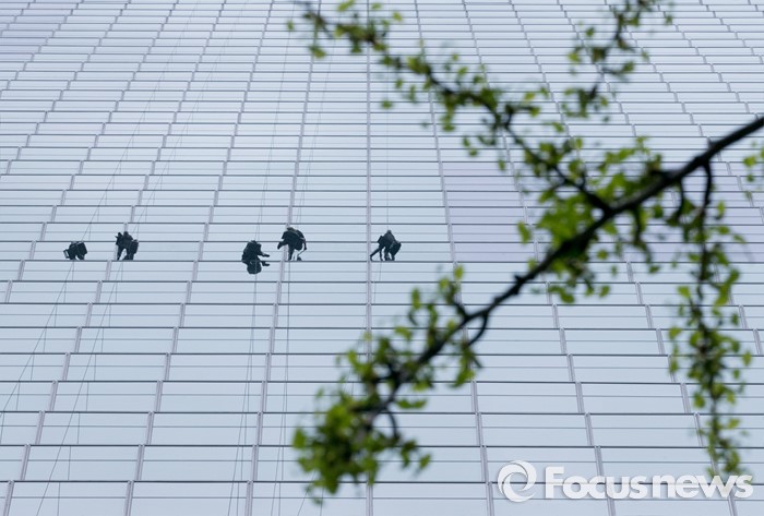 (서울=포커스뉴스) 비가 내린 21일 오전 서울 여의도 전경련회관에서 청소업체 관계자들이 회관 외벽 청소를 하고 있다.