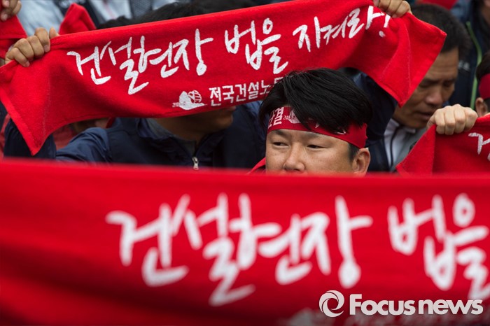 (서울=포커스뉴스) 21일 오후 서울역 앞에서 민주노총 전국건설노동조합 전국의 간부들이 건설노조 확대간부 결의대회를 열고 건설민생법안 통과를 촉구하는 집회를 하고 있다.