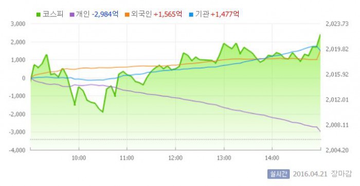 이날 코스피는 전일 대비 0.44% 상승한 2014.60으로 장을 시작했다. 이후 지수는 2010선 부근에서 등락을 반복했다. 그러나 장 후반 외국인·기관이 동반 매수에 나서자 상승폭을 확대하며 2020선을 넘어섰다.