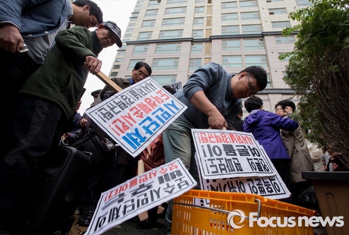 (서울=포커스뉴스) 최근 전경련의 차명계좌 자금 지원 의혹을 받고 있는 어버이연합 회원들이 21일 오후 서울 용산구 시사저널 사옥 앞에서 시사저널 규탄 기자회견을 마친 후 손팻말을 정리하고 있다.