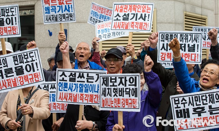 (서울=포커스뉴스) 최근 전경련의 차명계좌 자금 지원 의혹을 받고 있는 어버이연합 회원들이 21일 오후 서울 용산구 시사저널 사옥 앞에서 시사저널 규탄 기자회견을 하고 있다.