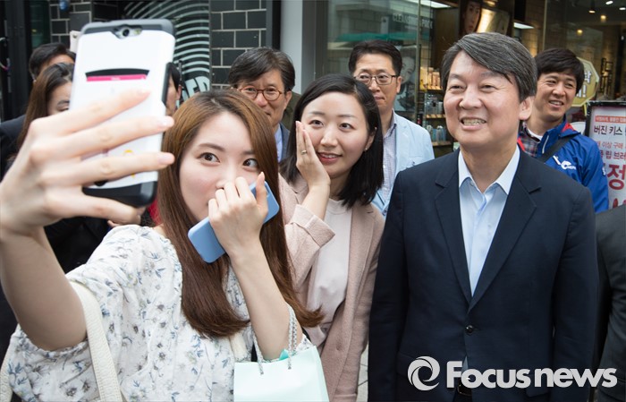 (청주=포커스뉴스) 안철수 국민의당 상임공동대표가 21일 오후 충북 청주 상당구 성안길을 찾아 시민들과 셀카를 촬영하고 있다. 안 대표는 4.13 국회의원선거에서 국민의당을 지지해준 것에 대한 감사의 뜻을 전했다.