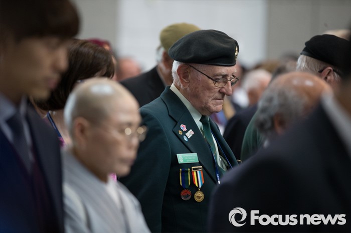 (서울=포커스뉴스) 21일 오후 서울 용산구 전쟁기념관에서 열린 6.25 전쟁영웅 선정패 수여식에서 참전용사들이 묵념을 하고 있다.