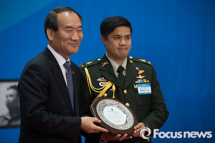 (서울=포커스뉴스) 21일 오후 서울 용산구 전쟁기념관에서 열린 6.25 전쟁영웅 선정패 수여식에서 박승춘 국가보훈처장이 전쟁영웅으로 선정된 태국인 아따난 손자에게 전쟁영웅패를 전달하고 있다.