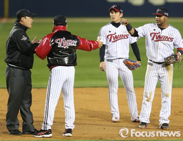 (서울=포커스뉴스) 21일 서울 잠실구장에서 열린 2016 프로야구 NC-LG 경기 5회 1사 1,2루에서 NC 이호준의 좌전안타때 LG 3루수 히메네스의 주루방해 판정에 양상문 LG 감독이 항의하고 있다.