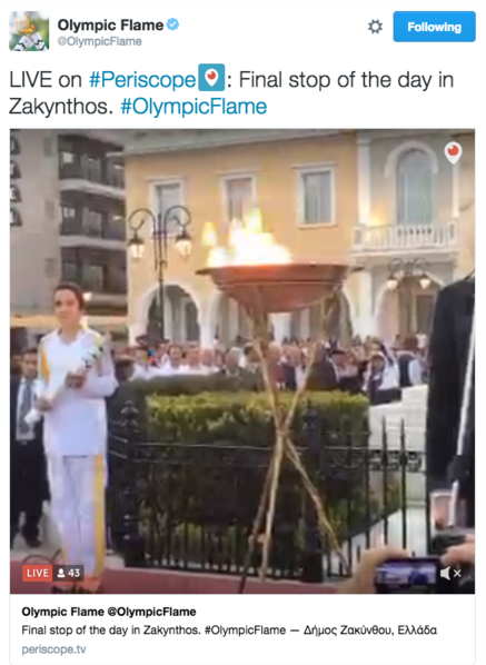 이번 올림픽 성화는 21일 고대 올림픽 발상지인 그리스 올림피아 헤라 신전에서 채화됐으며, 아테네와 스위스를 거쳐 브라질의 각 도시를 거친 후 올림픽 개막일인 8월 5일 리우의 마라카낭 올림픽 경기장에 도착할 예정이다. 남미대륙의 첫 올림픽인 제 31회 리우데자네이루 올림픽은 8월 5일 개막해 21일까지 17일간의 열전을 벌이게 된다.성화봉송 현장행사 실시간 페리스코프 방송 <사진제공=트위터>